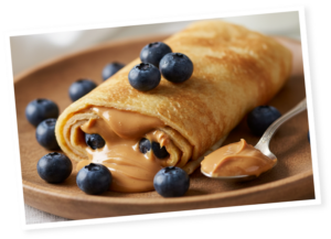 Sur une crêpe encore tiède, étalez une belle couche de beurre de cacahuète Creamy. Ajoutez une cuillerée de yaourt, quelques fruits rouges, puis un léger filet de miel. Roulez délicatement la crêpe, coupez-la en deux et servez immédiatement.