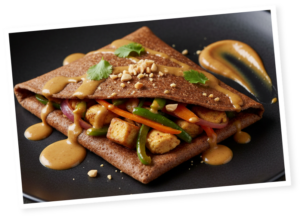 Galette salée façon satay : Peanut 100 % Crunchy, légumes et sauce cacahuète