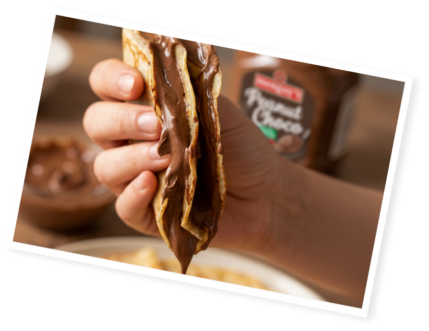 Étalez généreusement le beurre de cacahuète Choco sur la crêpe chaude. Disposez des rondelles de banane, parsemez d’éclats de cacahuètes, puis repliez la crêpe en triangle. Pour les amateurs, ajoutez un léger voile de cacao.