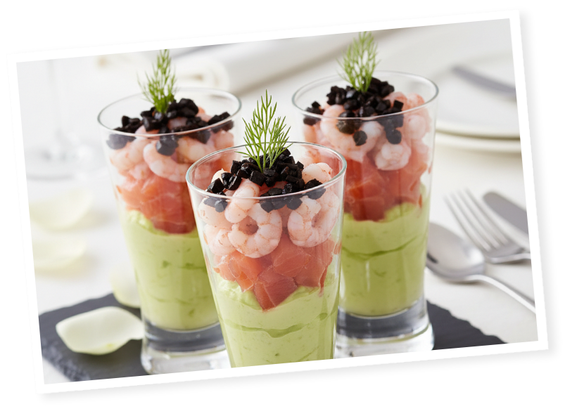 Ecrasez l’avocat avec du citron pour préserver sa couleur, puis alternez dans la verrine : crème d’avocat, dés de saumon fumé, petites crevettes décortiquées.