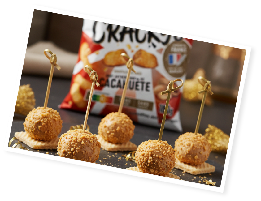 Les Cracky’s à la cacahuète sont d’abord réduits en miettes fines afin de former une panure légère. Le foie gras est ensuite démoulé puis façonné en petites billes à l’aide d’une cuillère parisienne. Après un tour de poivre, chaque bille est roulée dans la panure de Cracky’s pour s’enrober d’une couche délicatement croquante.