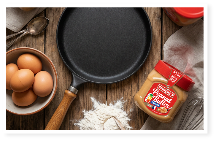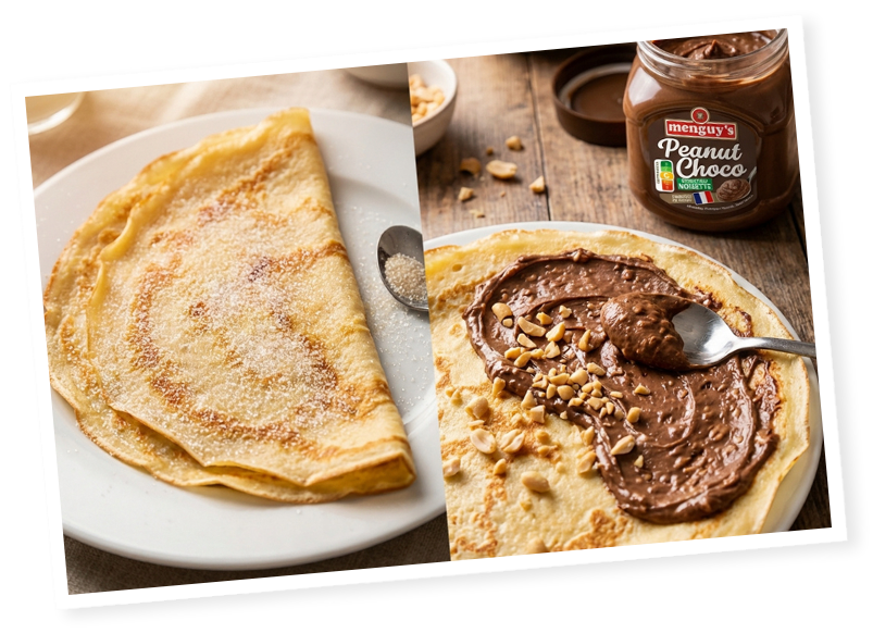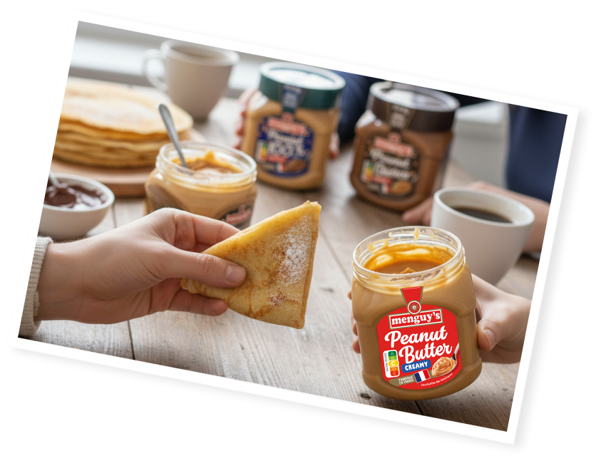 La gamme de beurres de cacahuète Menguy’s a été pensée pour couvrir tous les usages : Creamy, Crunchy, Peanut Choco, Peanut 100 %, Peanut 100 % Crunchy ou encore Peanut Butter Protéines… autant de textures et de profils qui trouvent naturellement leur place sur une crêpe, qu’elle soit sucrée ou salée.
