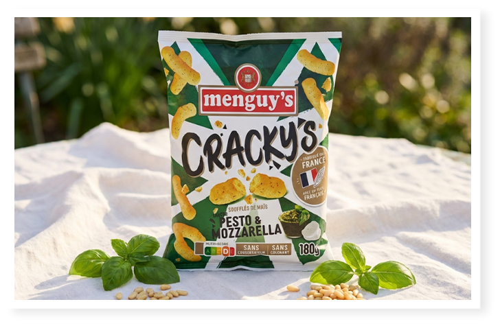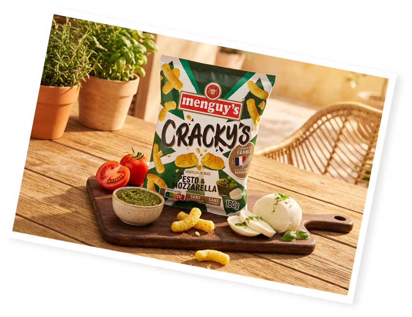 C’est dans cette atmosphère lumineuse que s’inscrit la nouvelle création de Menguy’s : les Cracky’s Pesto Mozza. Une innovation apéritive inspirée d’un grand classique italien, pensée pour retrouver tout le plaisir du pesto, associé à la douceur de la mozzarella, dans une bouchée craquante et résolument conviviale.