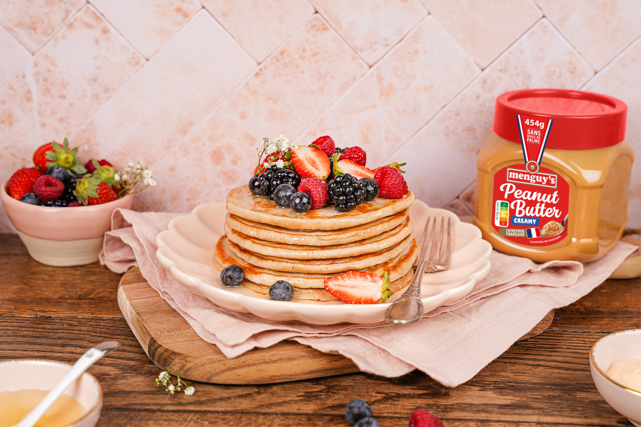 Peanut butter and red fruit pancakes